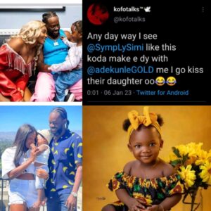 A Twitter user, Kofo talks, took to his Twitter page and he disclosed that any day he sees Adekunle and Simi together with their daughter he will make sure he kisses their daughter.