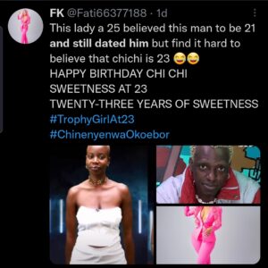 The fan wrote; “This lady a 25 believed this man to be 21 and still dated him but find it hard to believe that chichi is 23 😂😂 HAPPY BIRTHDAY CHI CHI