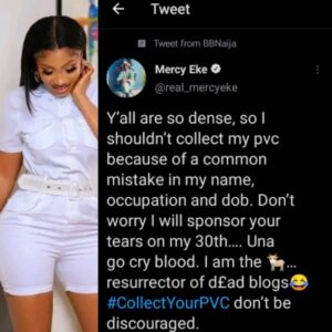 In her latest Tweet, Mercy disclosed that there was an error in her permanent voters card stating that she did not falsifying her age .