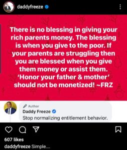 In his words; “There is no blessing in giving your rich parents money. The blessing is when you give to the poor. If your parents are struggling then you are blessed when you give them money or assist them. Honor your father and mother should not be monetized!” he wrote.