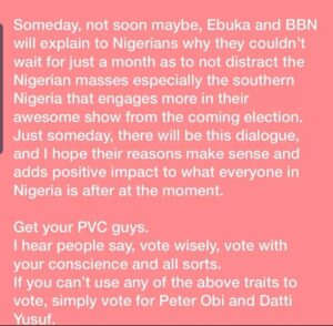 In his words; “Someday, not soon maybe, Ebuka and BBN will explain to Nigerians why they couldn’t wait for just a month as to not distract the Nigerian masses especially the southern Nigeria that engages more in their awesome show from the coming election.