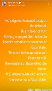 “Two judgements issues today at the tribunal. One in favor of PDP. Nothing changed. Sen. Ademola Adeleke remains the governor of Osun State. We move to the appeal court. Peace be still. The mandate of Osun will not be stolen. H.E Ademola y remains the Governor of Osun State”.