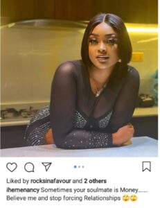 She wrote; “Sometimes your soulmate is Money……. Believe me and stop forcing Relationships”.