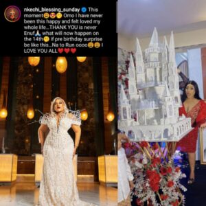Popular Nollywood actress and brand influencer, Nkechi Blessing Sunday have taken to her Instagram page to pen down an appreciation note to her friends and colleagues in the Nollywood industry for organizing a pre- birthday surprise party for her.