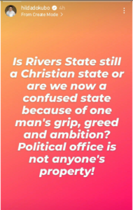 Hilda took to her instagram story, to express concern for her state.She questioned if Rivers state is still a christian state or now a confused state.