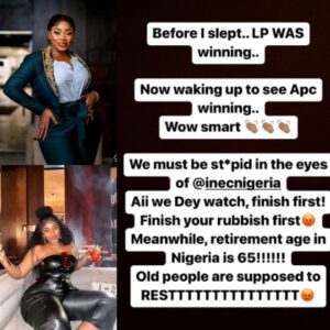 In her latest Instagram post , the 25- year – old skit maker said that last night , Peter Obi was leading in the election but waking up to discover that Tinubu was currently Winning in the Election was a shock to her.