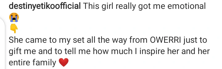 The fan said she wasn’t expecting to meet Destiny Etiko and she was excited that her gift was received by the actress.