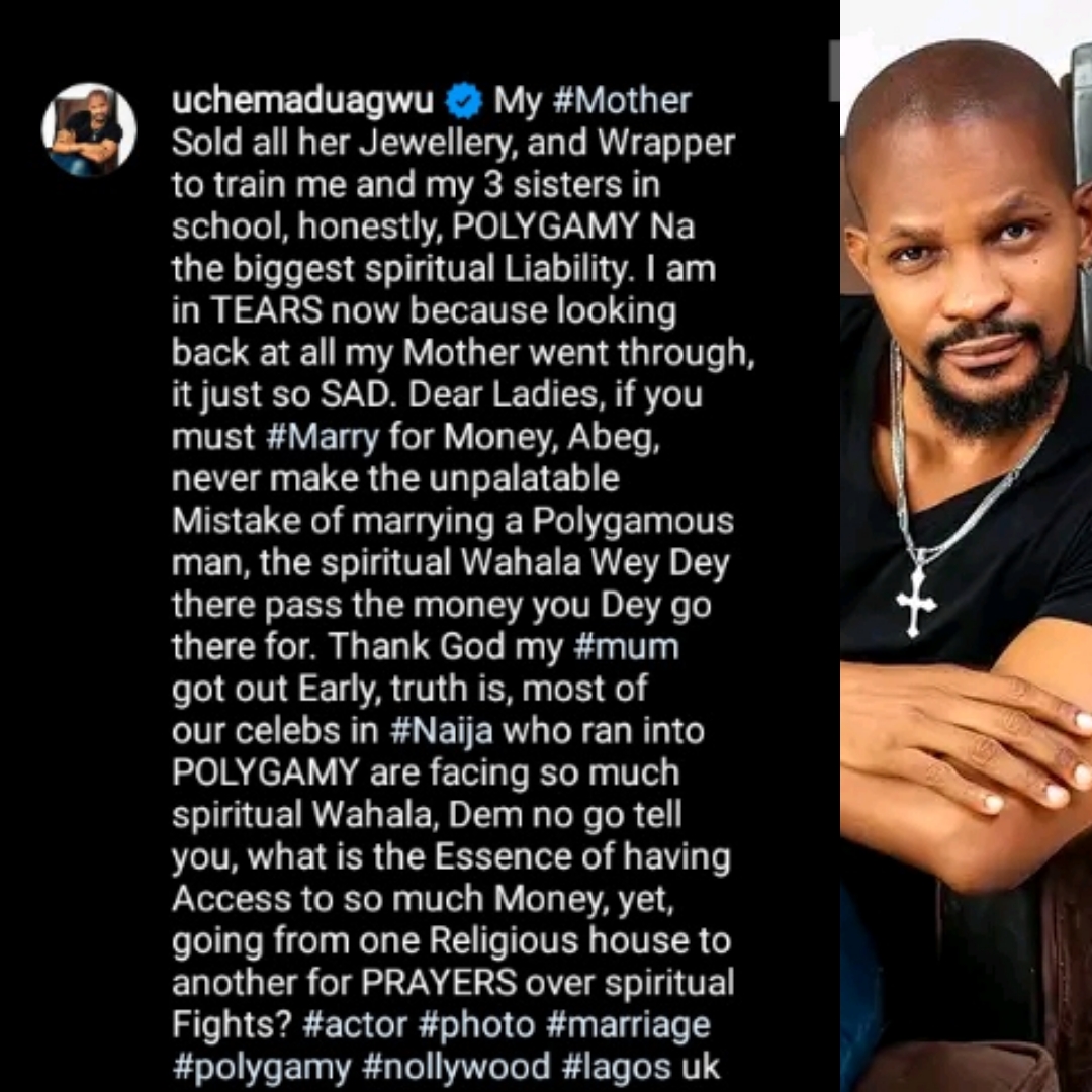 Uche Maduagwu, who is a popular Nollywood actor has adviced women not to marry polygamous men.In his latest Instagram post, the movie star made it known that polygamy is the biggest spiritual liability.