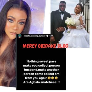 She wrote; “Nothing sweet pass make you collect person husband, make another person come collect am from you again 🤣🤣🤣 Ara Agbala snatcher!!!”.
