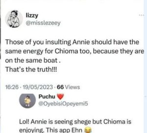 Replying a another netizen wrote; “Lol! Annie is seeing shege but Chioma is enjoying. This app Ehn😂”.