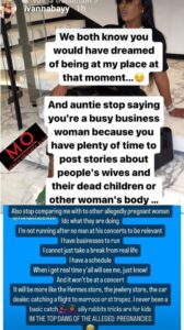 “We both know you would have dreamed at being at my place at that moment….and auntie stop saying you’re a busy woman because you have plenty of time to post stories about people’s wives and their dead children or other woman’s body…..