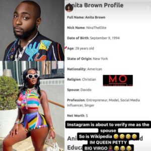 American business woman, Anita Brown, who claims to be pregnant for Davido, has bragged about being her soon to be verification on Instagram and Wikipedia as the legal wife of Davido.