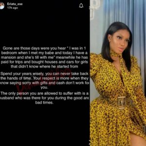 Famous skit maker , actress and former Big brother naija contestant, Ese Eriata has dished out a word to advice to ladies who are in a relationship.