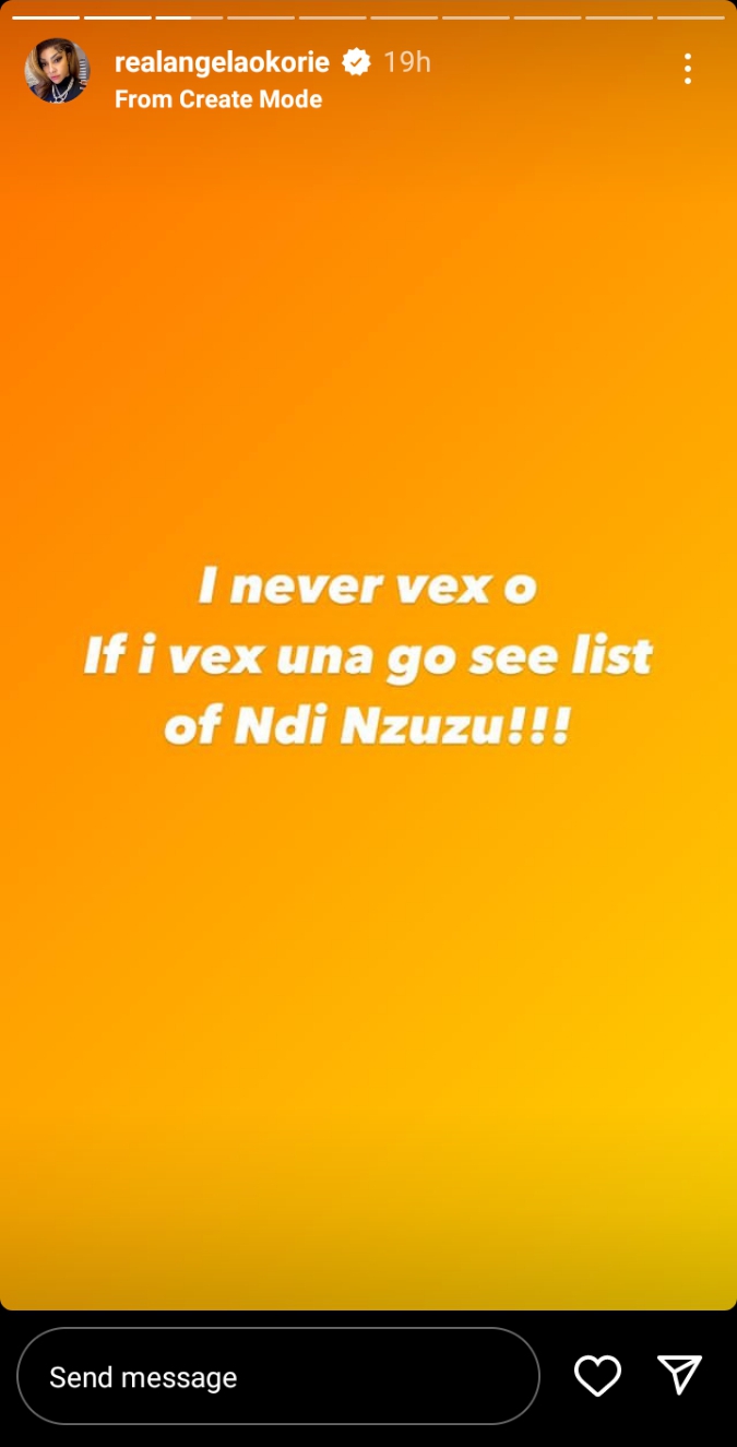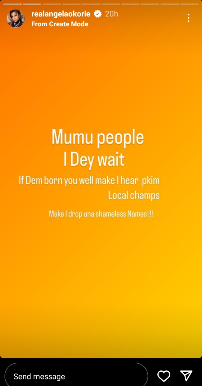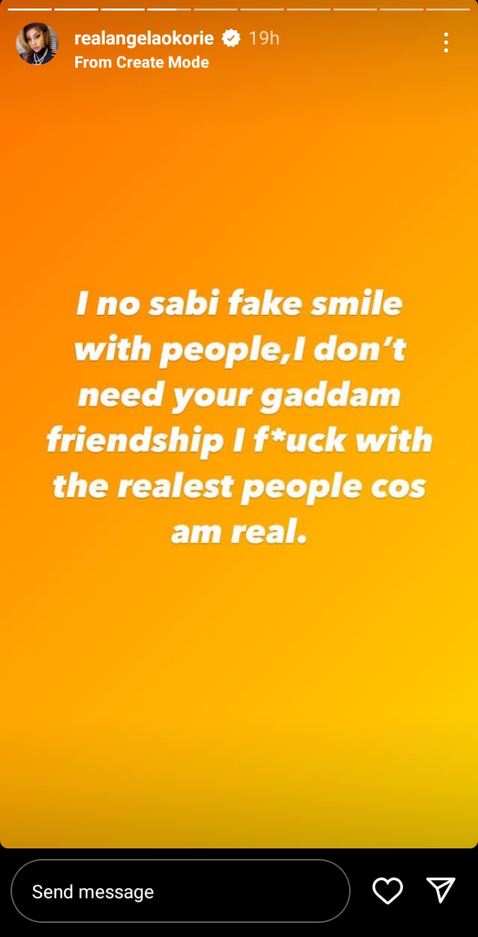 Angela, noted that these supposed enemies are “local champs” adding that she doesn’t fake her smile, and she doesn’t need their friendship because she is real and she relates with the real ones.