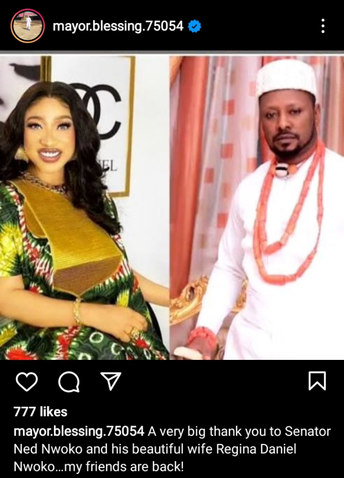 Kpokpogri’s best friend mayor blessing, confirms that the report of the peace making was true, as she said via her Instagram; “A very big thank you to Sen Ned Nwokoand his beautiful wife Regina Daniel Nwoko…my friends are back”