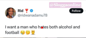 A social media user has stirred reactions online as she reveals that she wants a man who hate$ football and alcohol.