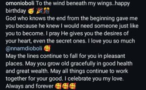 Accompanying her post, Omoni Oboli shared a throwback photo of herself and her husband with the caption,“To the wind beneath my wings , happy birthday. God who knows the end from.thd beginning gave me you because he knew I would someone just like you to become. I love you so much @nnamdioboli”.