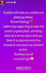 Her post reads, “If politics will make you unfollow me, please go ahead, no hard feelings. I won’t stop supporting efforts to make this country a great place”.