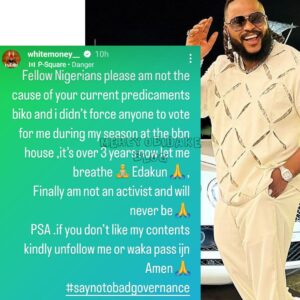 In an Instagram post, White Money stated that he’s not responsible for the economic situation of the country and didn’t force anybody to vote for him during his participation as a housemate on the Big Brother Naija reality show.