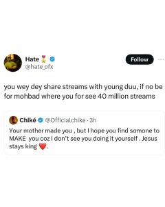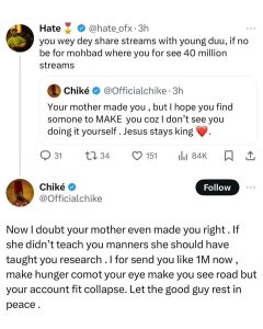 “Mohbad helped Chike gain massive streams. Without him, Chike wouldn’t have reached 40 million streams, especially considering they were once on par with artists like Young Duu”, @hateof tweeted.