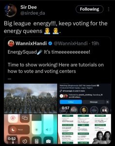 “Big league energy keep voting for the energy queens”, Sir Dee tweeted.