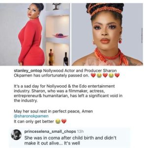 According to online reports, Sharon Okpamen tragically passed away following complications from childbirth.