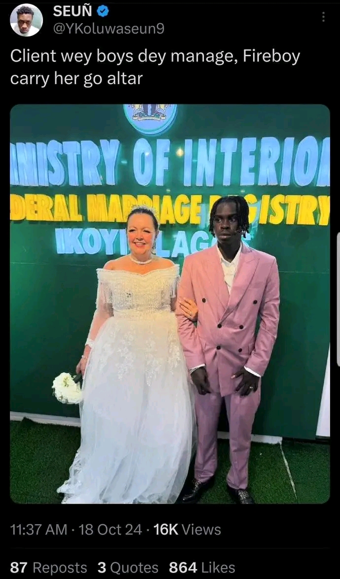Earlier, MO Media reported that social media erupted into a frenzy after a photo surfaced showing Fireboy DML and a Caucasian woman posing in wedding attire.