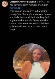 Chinwe hit back again, calling the troll a “witch” who bullies young women under the guise of righteousness and asserted that her critic’s children would “reap what you have sown.”