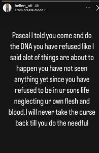 “Pascal I told you come and do the DNA you have refused. Like I said, a lot of things are about to happen. You have not seen anything yet since you have refused to be in your son’s life, neglecting your own flesh and blood. I will never take the curse back till you do the needful.”