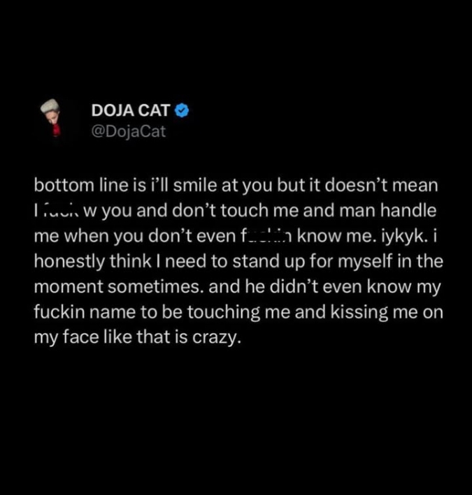 She wrote, “Don’t touch me and manhandle me when you don’t even f**kin’ know me… touching me and kissing me on my face like that is crazy.”