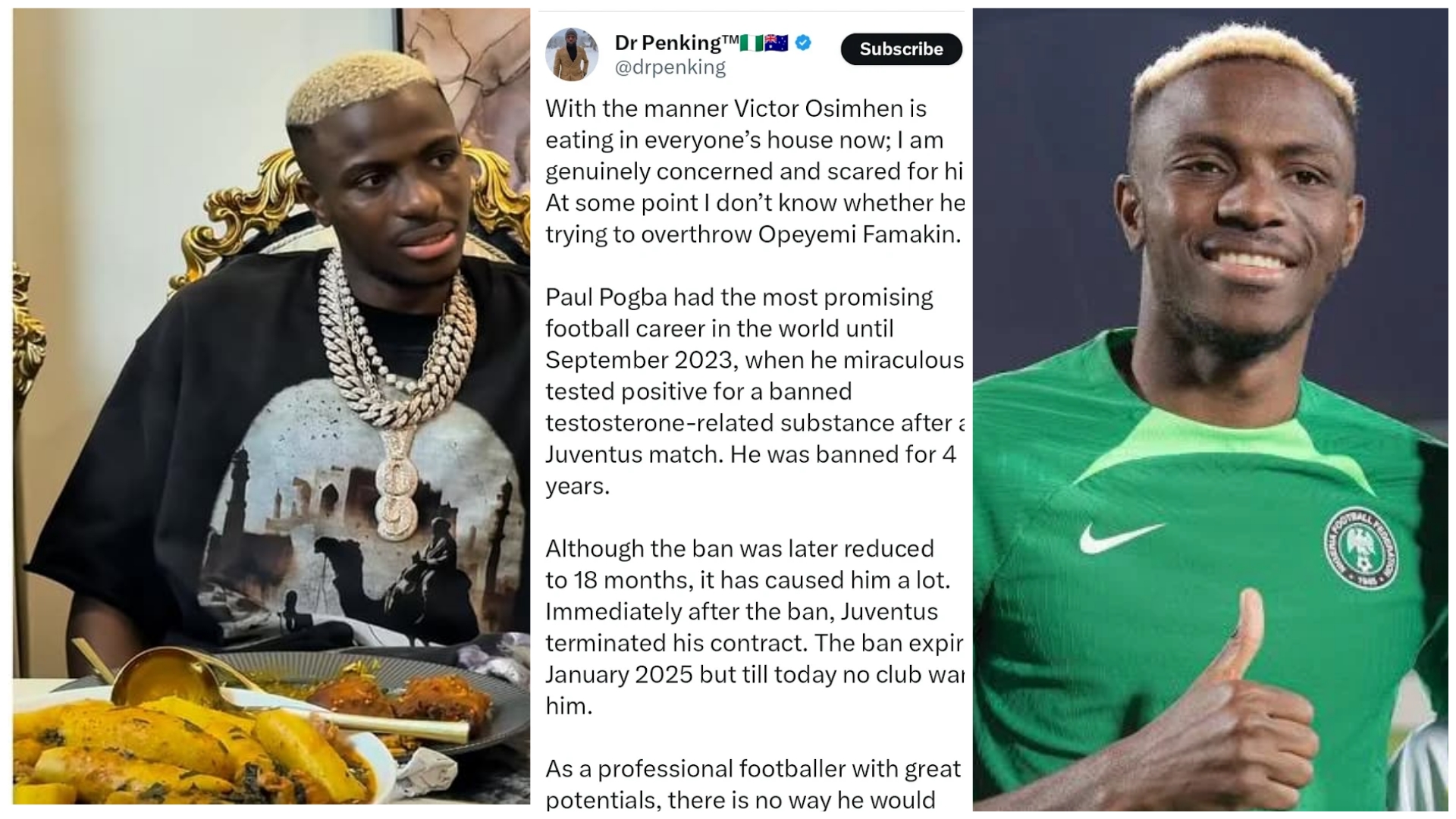 A popular online doctor on X (formerly known as Twitter), ‘Dr Penking’ has raised concern over how habitually Nigerian striker, Victor Osimhen is seen banqueting in people’s homes during his ongoing visit to Nigeria. In a broadly distributed post, the doctor warned the Super Eagles forward to be more tentative, especially as a professional footballer subject to anti-doping rules.