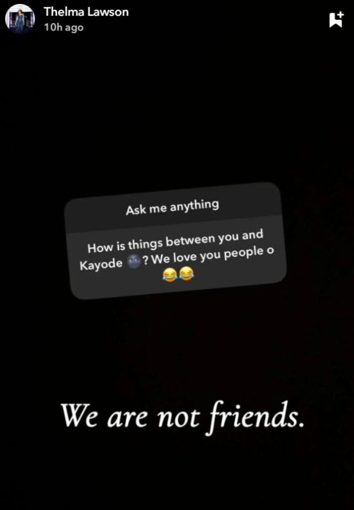 The drama began during a Snapchat question-and-answer session where Thelma was asked about her relationship with Kaybobo. A fan had playfully written, “How is things between you and Kayode 😘? We love you people 😂😂”, to which Thelma curtly replied, “We are not friends.”