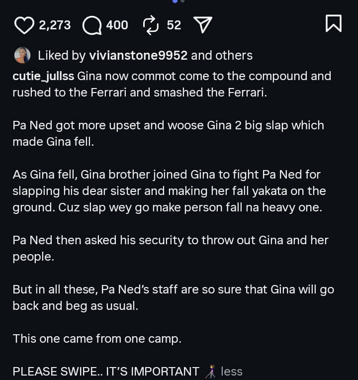 The report further states that Regina allegedly rushed to the couple’s Ferrari and damaged it. “Pa Ned got more upset and woose Gina 2 big slap which made Gina fell. As Gina fell, Gina brother joined Gina to fight Pa Ned for slapping his dear sister and making her fall yakata on the ground. Cuz slap wey go make person fall na heavy one,” Cutie Jules added.