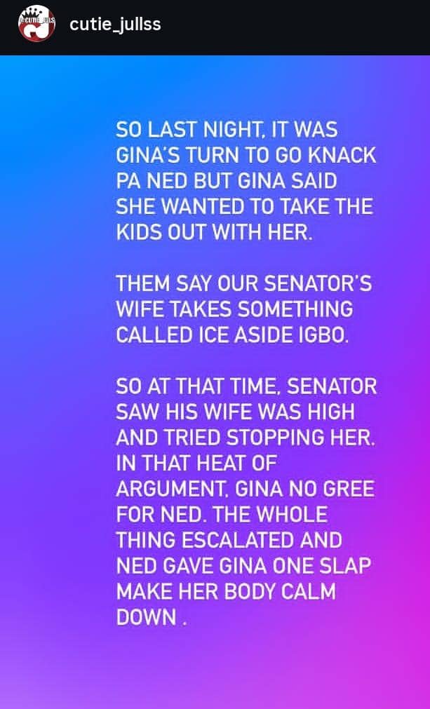 According to Cutie Jules, the dispute began when it was Regina’s turn for a bedroom session with her husband, but she reportedly wanted to take her children out instead. The blogger also claimed that Regina was allegedly under the influence of a substance referred to as “ice,” prompting Senator Nwoko to try to stop her.