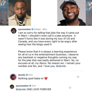 Please know that it is always a learning experience for all of us in the entertainment business. I deserve any backlash or negative thoughts coming my way for the joke that was badly delivered in Warri. So, no excuses at all, my Aburo. No reason am. I remain your number one fan, and I love you, @davido