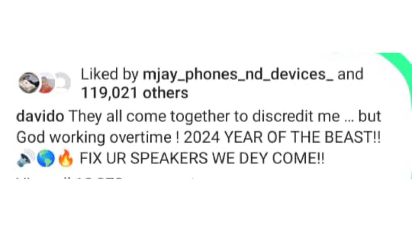 Davido wrote: “They all come together to discredit me ..but God working overtime! 2024 YEAR OF THE BEAST!! FIX UR SPEAKERS WE DEY COME!!”
