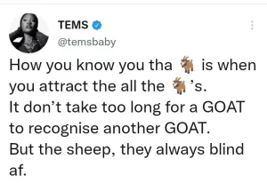 Moments later, Tems took to her Twitter page to boast that you only know you’re a GOAT – a word which describes a person who has performed remarkably – when you attract other GOATs.