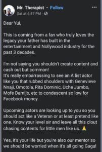 It’s really embarrassing to see an A list actor like you that rubbed shoulders with Genevieve Nnaji, Omotola, Rita Dominic, Uche Jumbo, Mofe Damijo, etc to condescent so low for Facebook money.