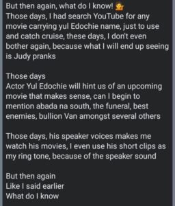 Those days, I had search YouTube for any movie carrying yul Edochie name, just to use and catch cruise, these days, I don’t even bother again, because what I will end up seeing is Judy pranks