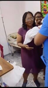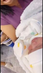 In the video, the content creator is seen holding the new born child and handing over to his family, while he also paid attention to his wife laying on the delivery bed.
