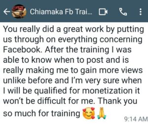 – Answer: You can register for the training by Paying the training fee, and sending your details to obidakemercy@gmail.com or 09065109668 (Whatsapp). Don’t miss this opportunity to invest in your future as a content creator and Facebook monetization specialist!