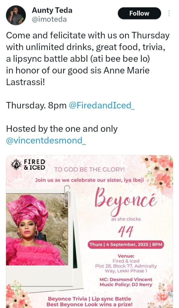 The announcement was made on the microblogging platform X by @inoteda, who revealed that the event will take place at Fired and Ice in Lekki.