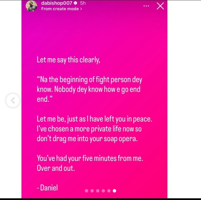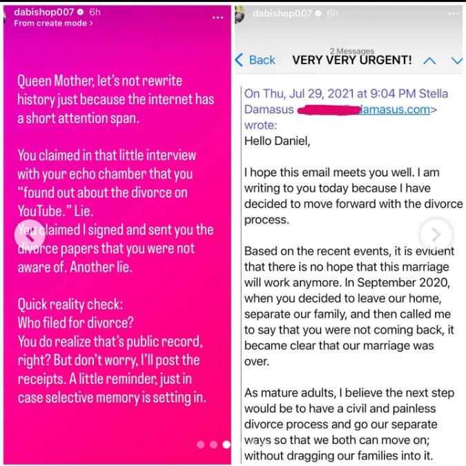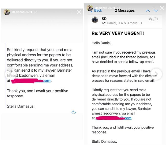 In response to the allegation, Daniel clarified on his Instagram page that he hasn’t spoken since they parted ways. He declared that he would stomach anything except lies. He provided screen shots of an email Stella sent him on July 20, 2021, requesting an address to which the divorce papers should be sent.