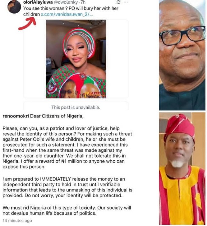 Former presidential aide, Reno Omokri, has sparked online reactions after offering a N1 million reward to anyone who can unmask the person behind a disturbing post about Peter Obi’s wife and children.