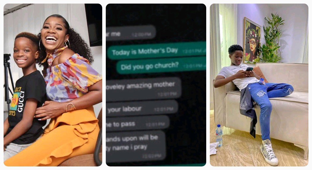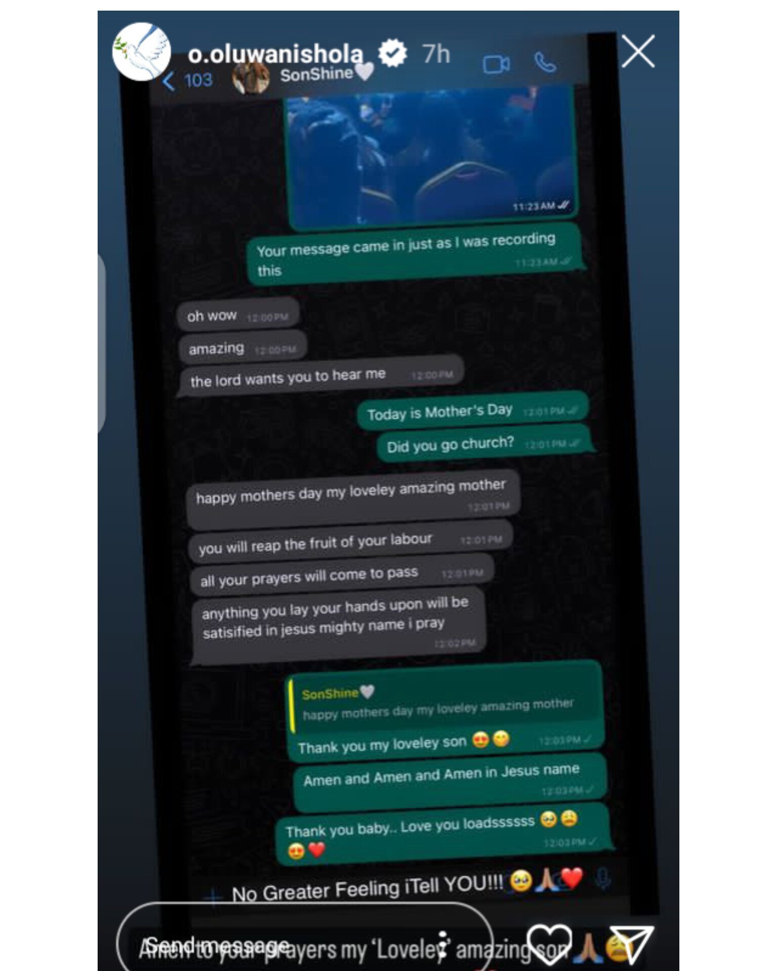 Taking to her official Instagram handle, Oluwanishola posted a screenshot of the mother’s day message her son sent to her.